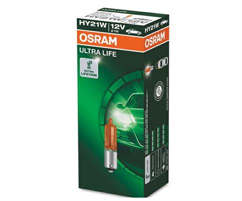 Lampada alogena del tipo HY21W 12V 21W per luci di segnalazione con durata quattro volte più lunga rispetto alle lampade standard. Le lampade Osram Ultralife 64137ULT hanno una potenza luminosa di 300 lumen, un attacco del tipo BAW9s e una lunghezza di 39,9 mm.